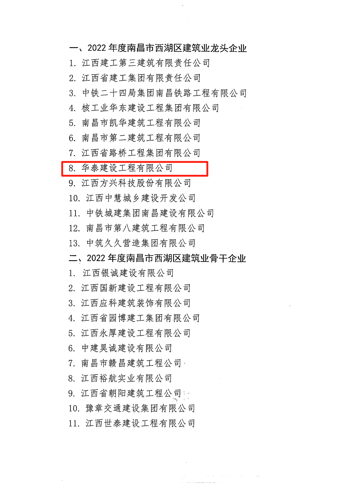 2023年2月21日,恰逢農(nóng)歷二月二龍?zhí)ь^,在這個紅紅火火的日子,南昌市西湖區(qū)住房和城鄉(xiāng)建設(shè)局發(fā)布了《關(guān)于公布2022年度南昌市西湖區(qū)建筑業(yè)龍頭企業(yè)、骨干企業(yè)名單的通報》,經(jīng)層層嚴(yán)格考評認(rèn)定,華泰建設(shè)工程有限公司憑借實(shí)干篤行與卓越品質(zhì)獲得“2022年度南昌市西湖區(qū)建筑業(yè)龍頭企業(yè)”榮譽(yù)稱號!