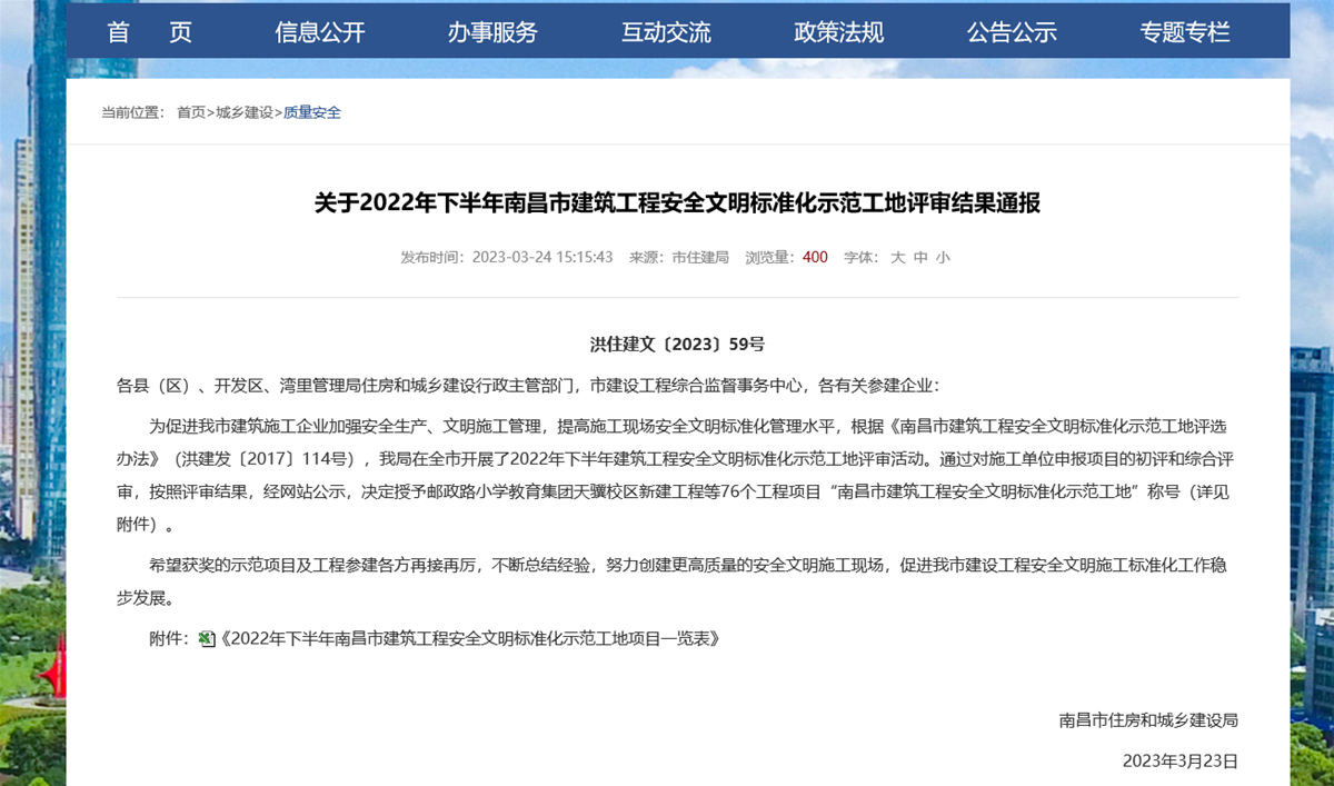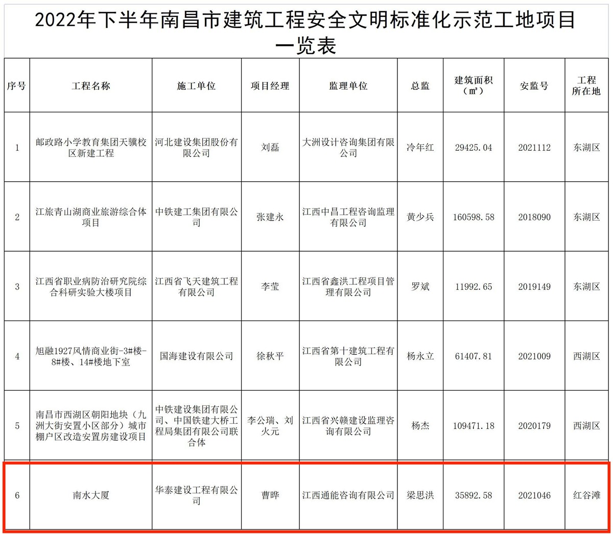 近日,南昌市住房與城鄉(xiāng)建設局公布了2022下半年南昌市建筑工程安全文明標準化示范工地評選結果,華泰建設工程有限公司“南水大廈”項目榜上有名。